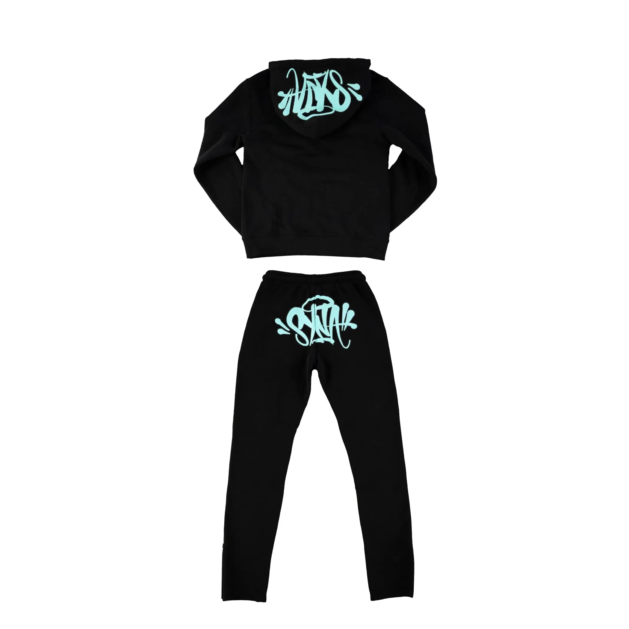 Introducing the eagerly awaited Synaworld tracksuit by Central Cee, also known as the Syna logo tracksuit. Available in a sophisticated Grey hue adorned with chic Black accents and featuring Chunky Black rope draw strings, this coveted set includes both the trendy hoodie and comfortable joggers.