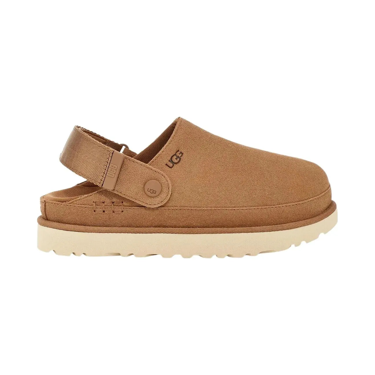 Introducing, the UGG Goldenstar Clog! With a suede upper and adjustable strap this is the perfect transitional mule to keep you comfy and cosy. A rubber outsole making these perfect for any surprise adventures. UGG branding on the front, sides and heel in chestnut completing the look.